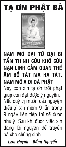 LỜI NGUYỆN TẠ ƠN PHẬT BÀ. Nam Mô Đại Từ Đại Bi Tầm Thinh Cứu Khổ Cứu Nạn Quảng Đại Linh Cảm Quán Thế Âm Bồ Tát Ma Ha Tát. Nam Mô A Di Đà Phật. Ngày đọc 9 lần hoặc hơn, đọc liên tục 18 ngày bạn sẽ được toại nguyện điều bạn muốn (hứa đăng loan truyền cho người khác). TIẾN - TÚ