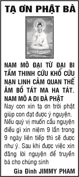 LỜI NGUYỆN. Nam Mô Đại Từ Đại Bi Tầm Thinh Cứu Khổ Cứu Nạn Quảng Đại Linh Cảm Quán Thế Âm Bồ Tát Ma Ha Tát. Nam Mô A Di Đà Phật. Ngày đọc 9 lần hoặc hơn, đọc liên tục 18 ngày bạn sẽ được toại nguyện điều bạn muốn (hứa đăng loan truyền cho người khác) VKC - DIỆU LAN