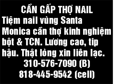 CẦN GẤP THỢ NAIL Tiệm Nail vùng Santa Monica cần thợ kinh nghiệm bột & TCN. Lương cao, tip hậu. Thật lòng xin liên lạc. L/L: 310-576-7090 (B), 818-445-9542 (Cell)